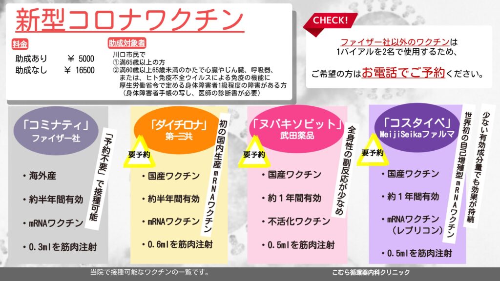 ※ファイザー以外は1バイアルを2名で使用する製剤のため、お電話で予約をおとりいたします。