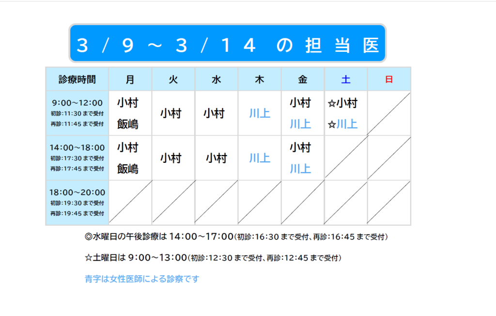 2026.03.07 3/9~3/14担当医のお知らせ