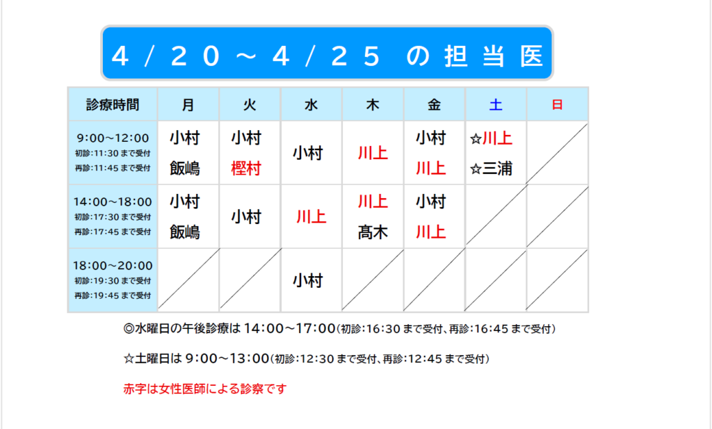 2026.04.18 4/20~4/25担当医のお知らせ